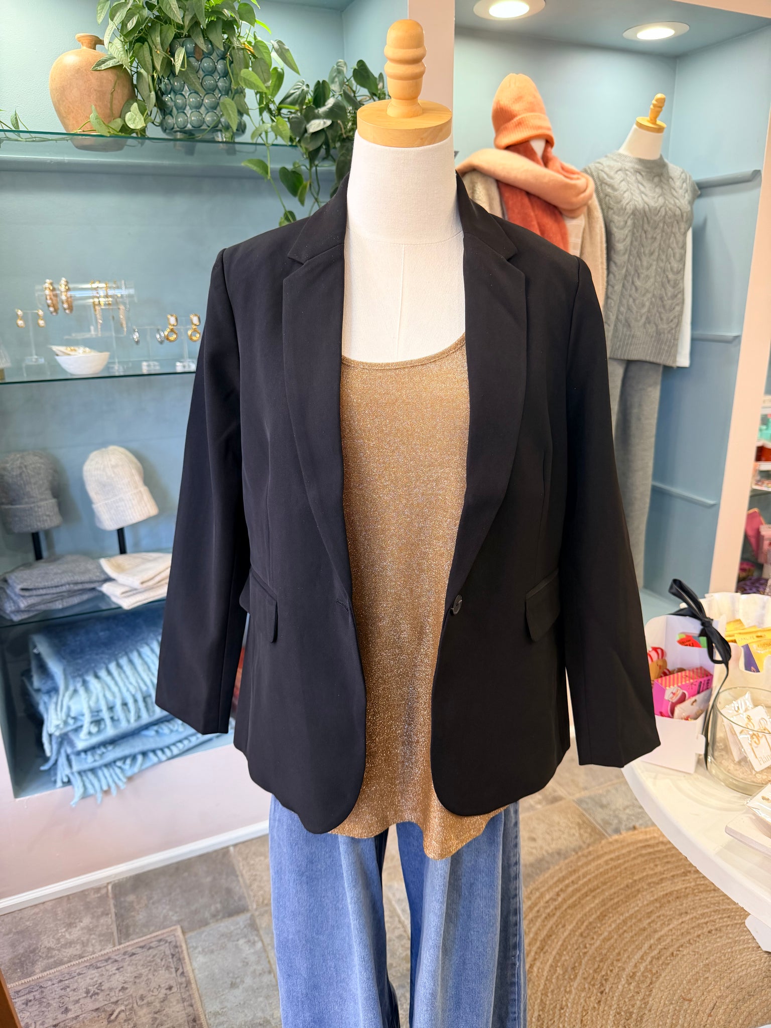 A must-have for any wardrobe, our black blazer features a single button closure and classic design. Perfect for any occasion, this versatile blazer is a timeless staple that elevates any look. Add a touch of sophistication to your style with this closet essential.