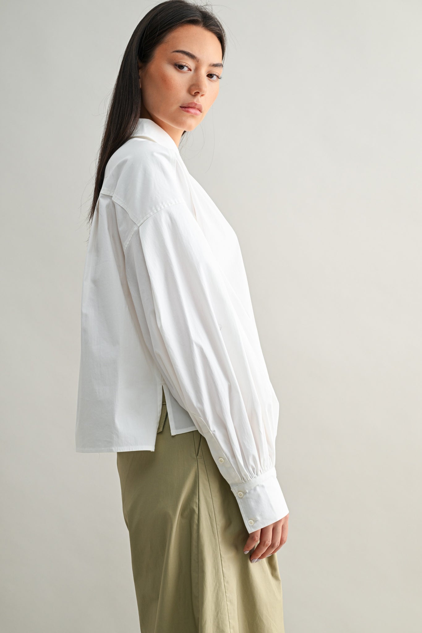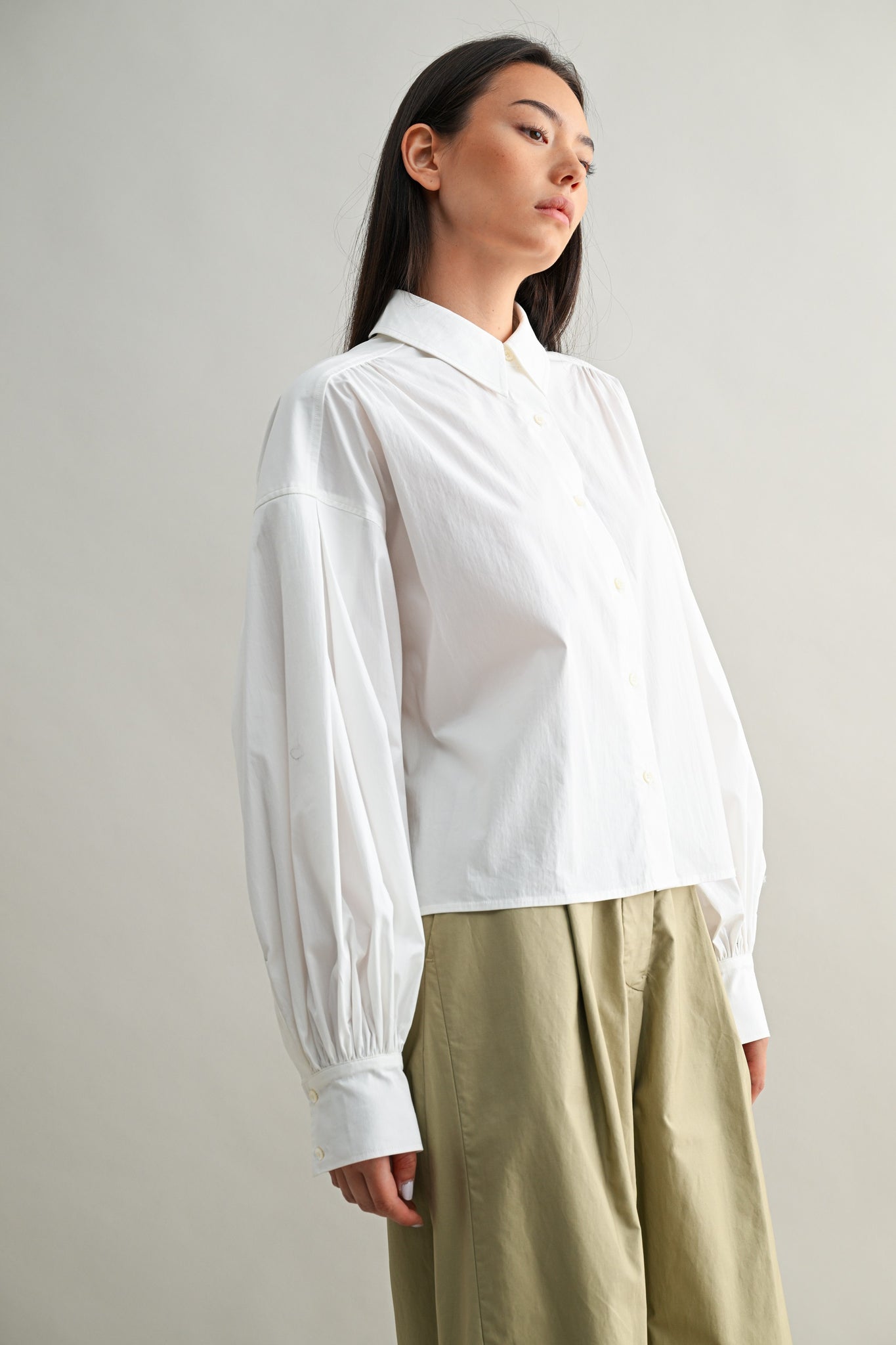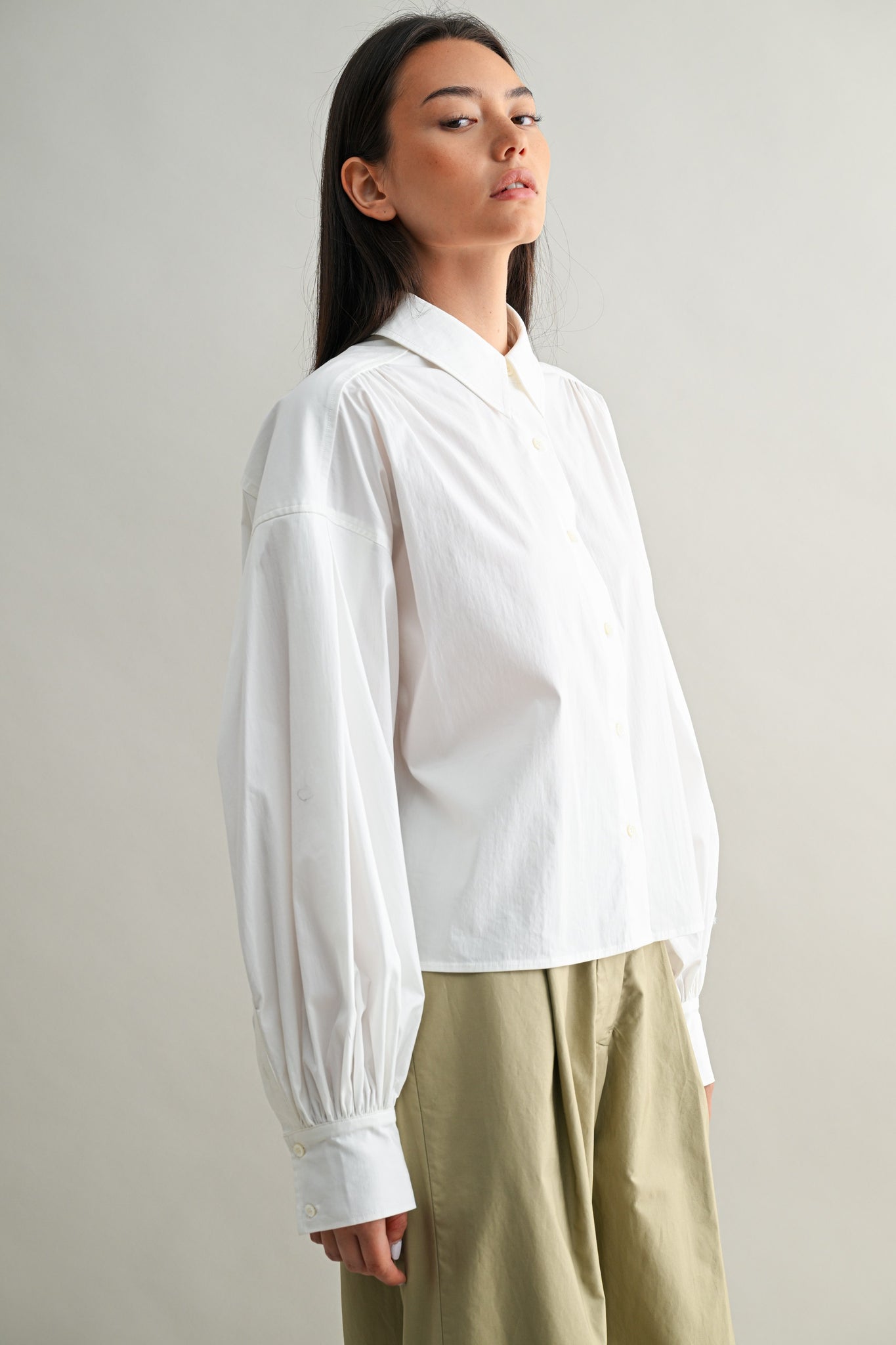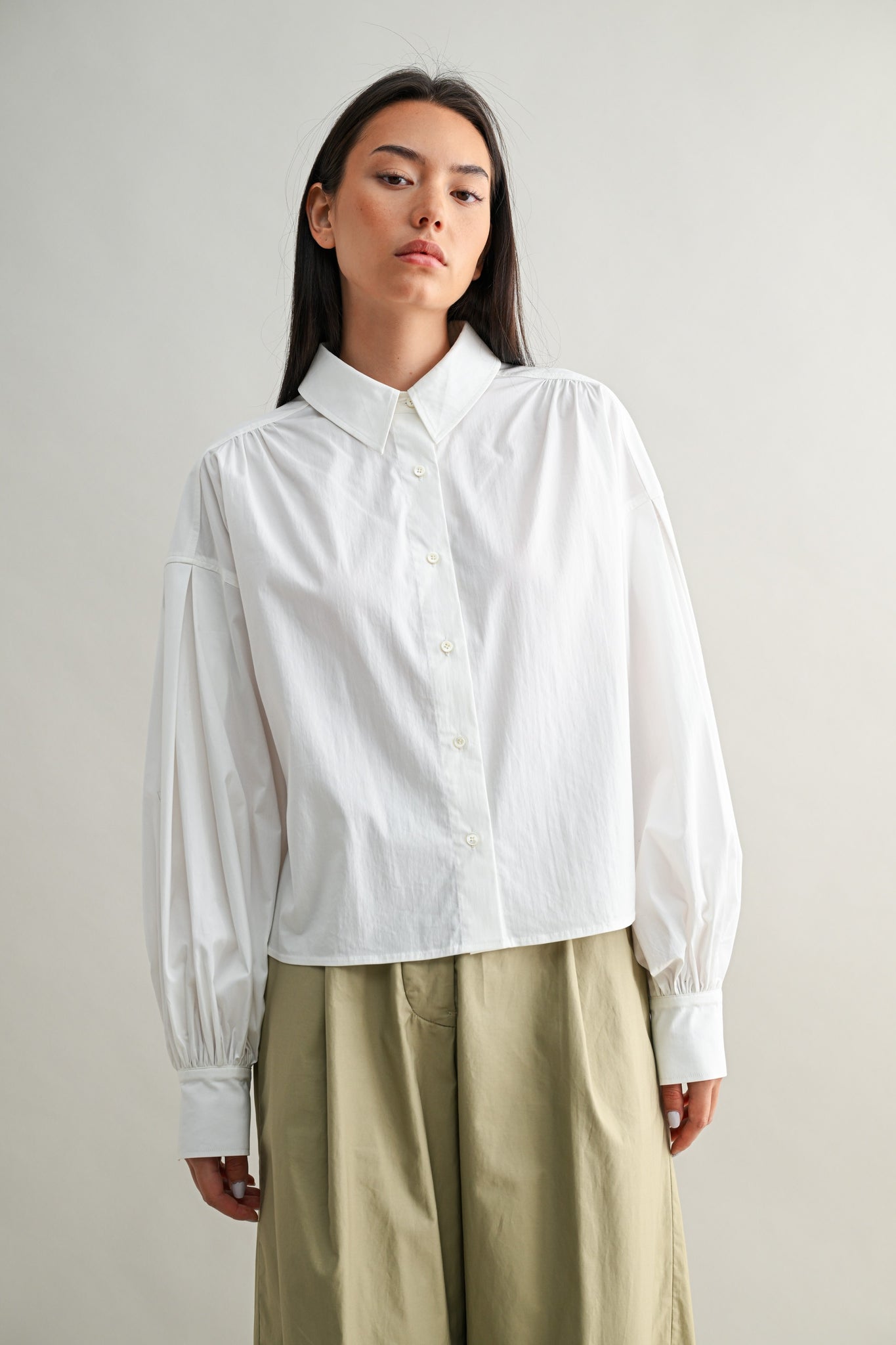 Cotton mix long balloon sleeve oversized shirt featuring a classic collar and button-down front. Designed with gathered sleeves and wide cuffs detail.