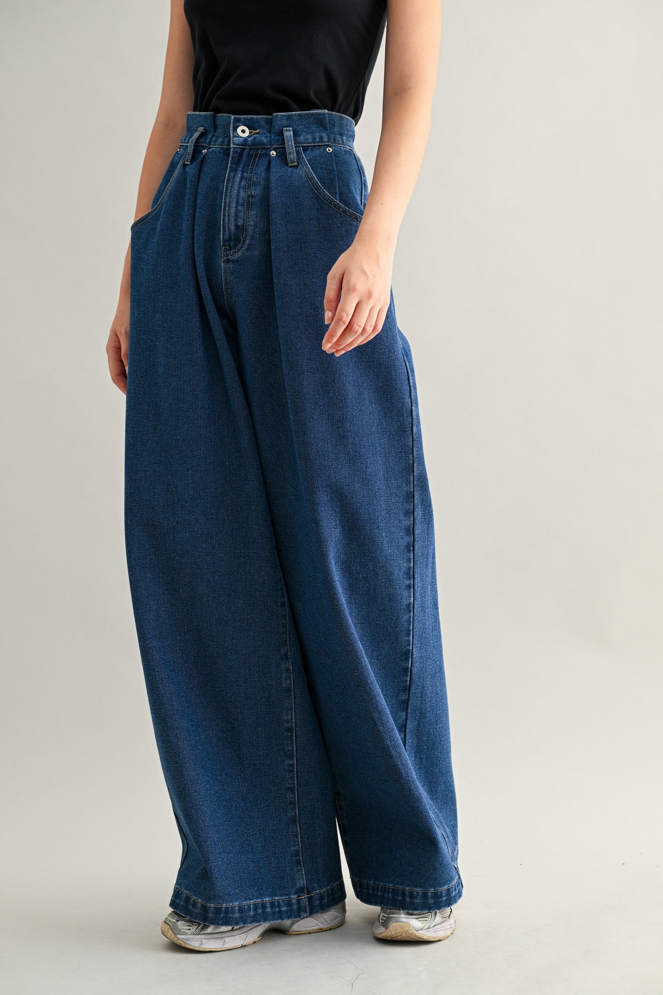 Mid-rise wide-leg jeans with pleated front detailing and angled side pockets. Features a button fly closure, belt loops, and silver rivet accents. Made from structured, non-stretch denim for a clean and sculpted silhouette.