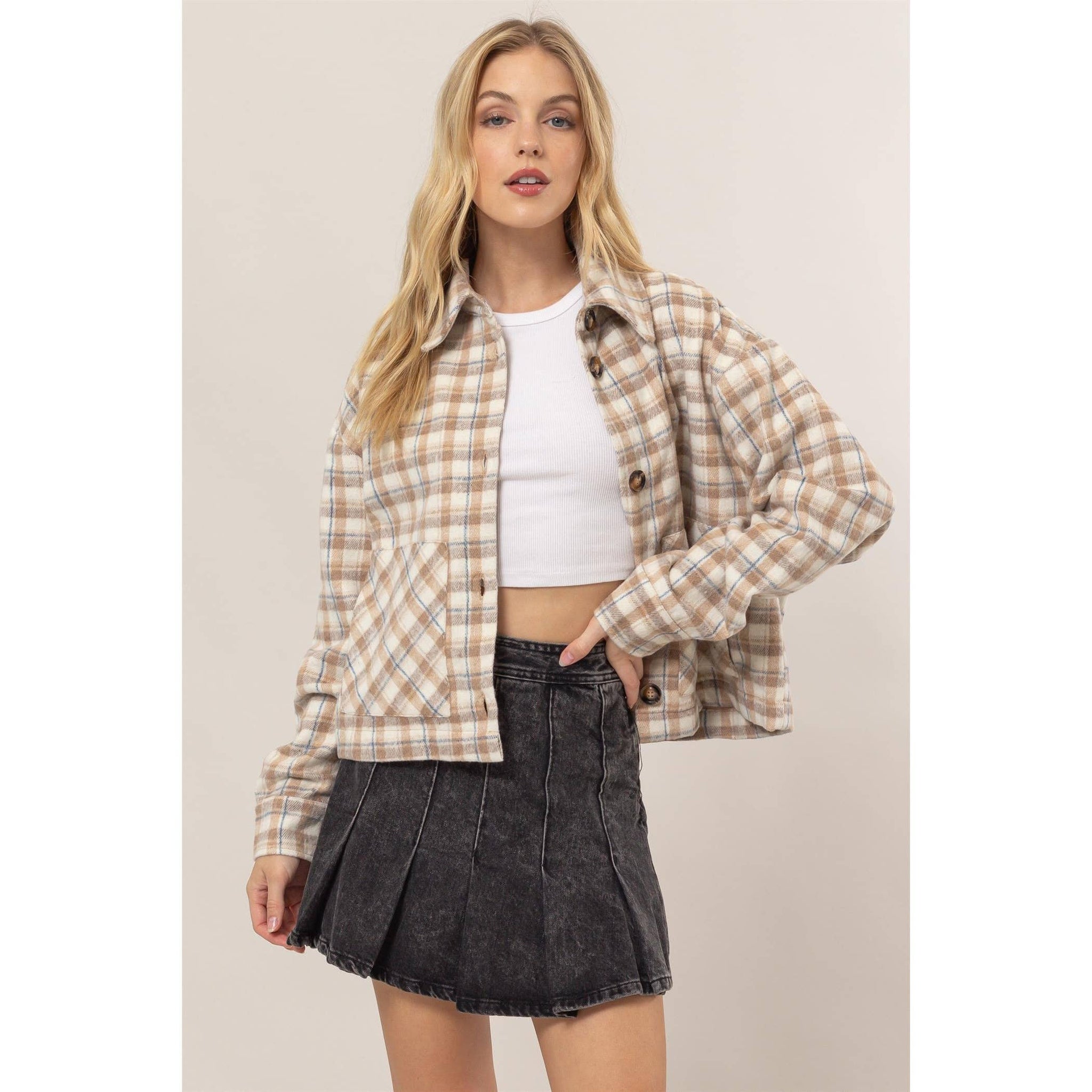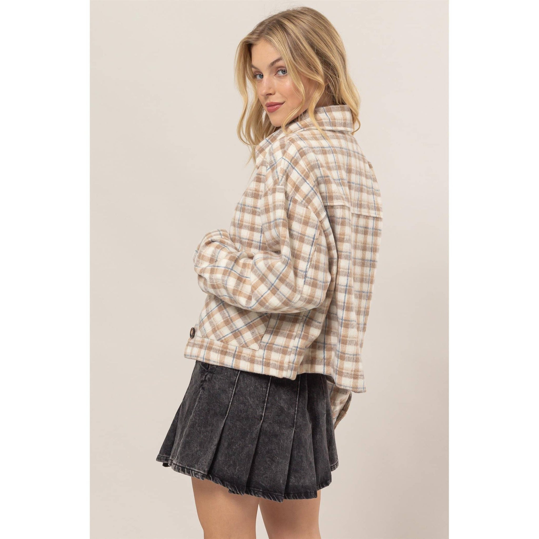 This modern jacket has an allover plaid pattern adds a timeless touch to this jacket that's tailored with a point collar, drop shoulders and long sleeves. The relaxed bodice has patch pockets and a button placket down the front.