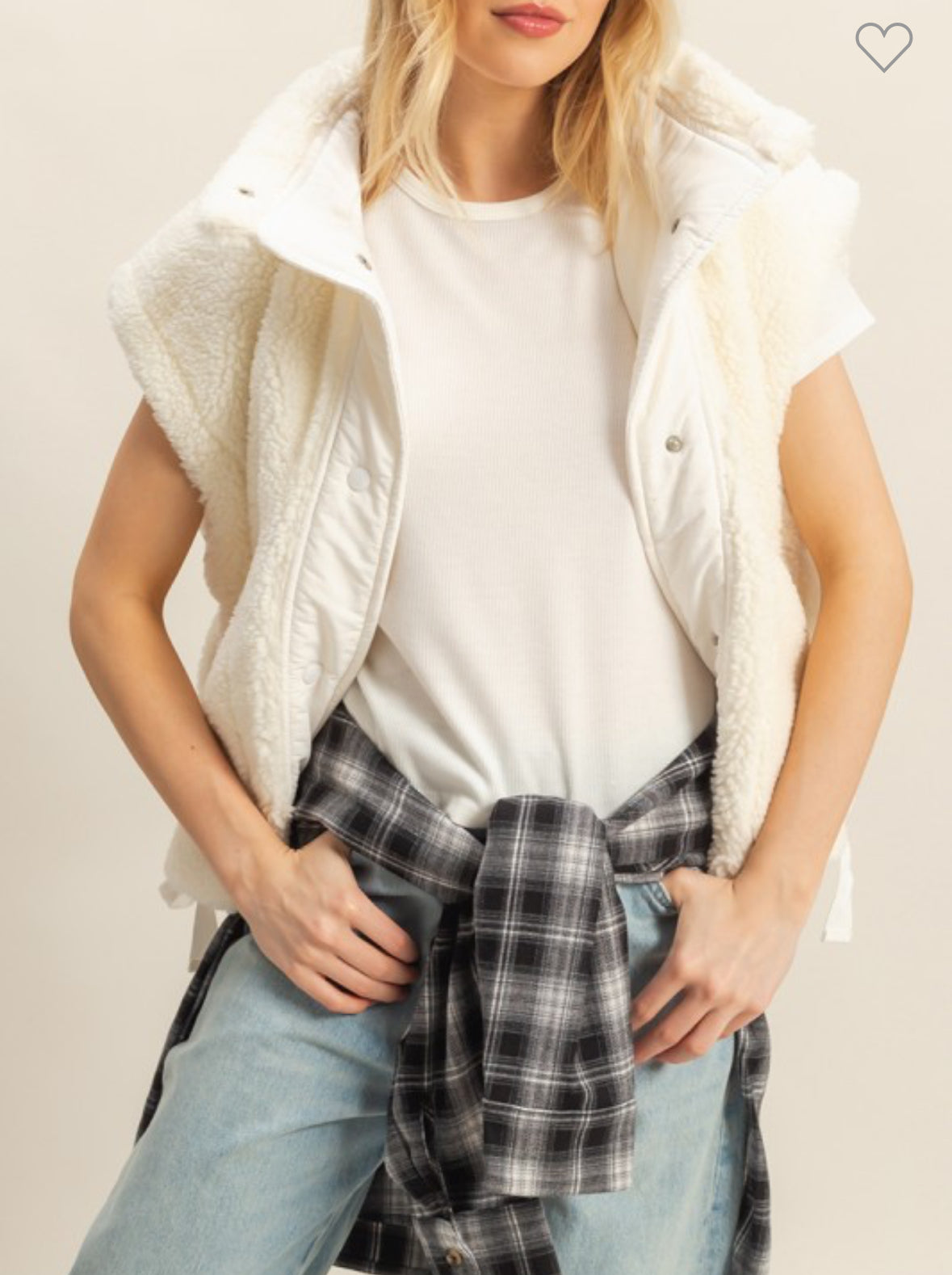 Your layering essential for chilly days. This ultra-soft sherpa vest combines comfort with versatility, giving you a cozy yet laid-back vibe. The sleeveless cut makes it perfect for layering over tees, flannels, or knits, while the adjustable side ties add a modern, playful touch. Finished with snap buttons, it’s as practical as it is stylish.